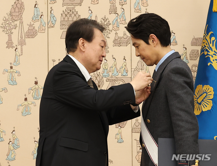尹錫悦大統領、ファン・ドンヒョク監督と俳優イ・ジョンジェに金冠文化勲章を授与(4/16)