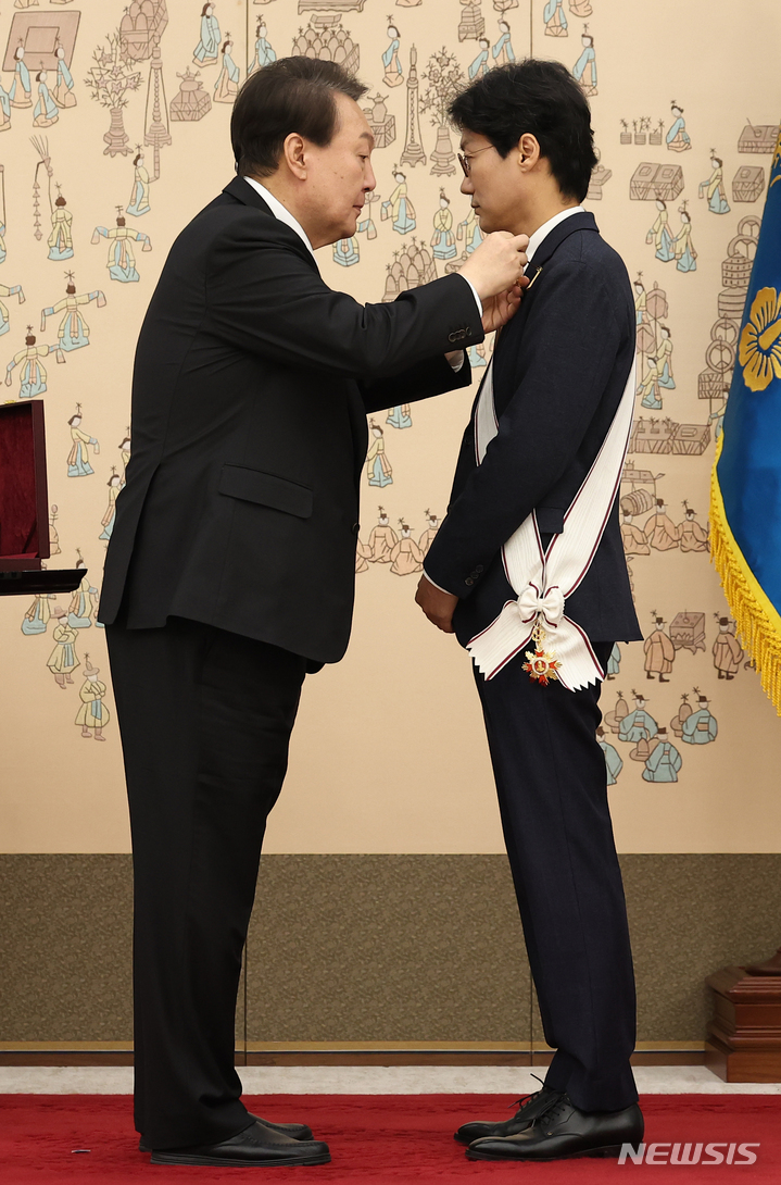 尹錫悦大統領、ファン・ドンヒョク監督と俳優イ・ジョンジェに金冠文化勲章を授与(6/16)